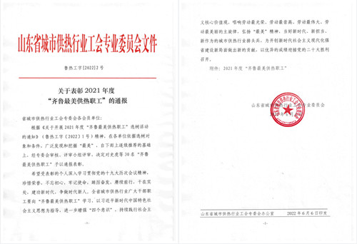【喜報】公司職工宋冬冬獲2021年度“齊魯最美供熱職工”榮譽稱號