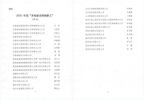 近期,山東省城市供熱行業(yè)工會專業(yè)委員會發(fā)布《關于表彰2021年度“齊魯最美供熱職工”的通報》,對山東省內多家供熱企業(yè)的30名職工進行了表彰。濱州熱力有公司職工宋冬冬獲選獲2021年度“齊魯最美供熱職工”榮譽稱號。