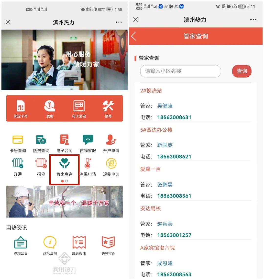 如遇其他用暖問(wèn)題,用戶可以撥打?yàn)I州熱力有限公司24小時(shí)服務(wù)熱線968111或者所屬轄區(qū)供熱管家電話。管家電話可以在濱州熱力微信公眾號(hào)和濱州供熱APP,輸入小區(qū)名稱進(jìn)行查詢。